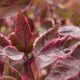 Bladverk: Hjärtformade karminröda blad vid lövsprickning